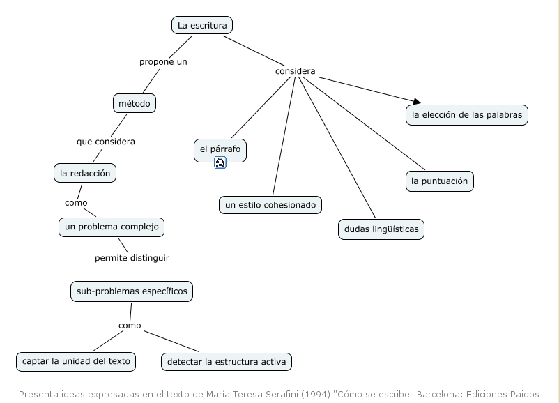 Este Cmap, tiene información relacionada con: Escritura, sub-problemas específicos como captar la unidad del texto, un problema complejo permite distinguir sub-problemas específicos, La escritura considera dudas lingüísticas, La escritura considera la puntuación, La escritura considera el párrafo, la redacción como un problema complejo, sub-problemas específicos como detectar la estructura activa, método que considera la redacción, La escritura considera un estilo cohesionado, La escritura considera la elección de las palabras, La escritura propone un método